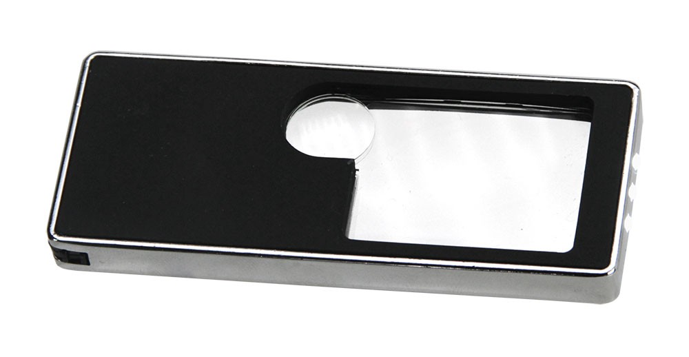 Utdragbar lins, skyddas av höljet i fickan. Två linser: 21mm med 30x förstoring 12mm med 60x förstoring Led-ljus UV-ljus för kontroll av t.ex. sedlar, ej lika kraftfull som ett UV-rör som används till frimärken. Yttermått infälld 100 x 40 x 20 mm