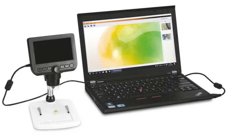 Mikroskopet är speciellt framtaget med bildskärmen och batteridrift för att man inte skall behöva använda en dator, men givetvis kan det även kopplas till datorns USB för att se bilden på datorskärmen.