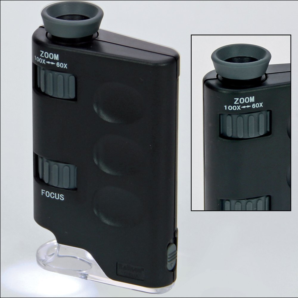Ljuset g år att rikta efter behov. Extra ratt för finjustering. Drivs med 2 st batterier. 60-100x förstoring – steglöst inställbar. Med stativ Storlek: 170 x 48 x 25 mm Till frimärken och mynt rekommenderar vi mikroskopet utan stativ nr. 1032