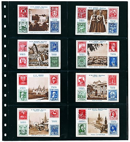 4 fickor/sida. Fickornas höjd 72 mm. Helt av folie, dubbelsidiga (fickor på båda sidor), svart bakgrund. Format: 240 x 305 mm Fickornas längd är 220 mm. Hålstansning för 4 ringar med avstånd 80-80-80 mm Paket med 5 blad