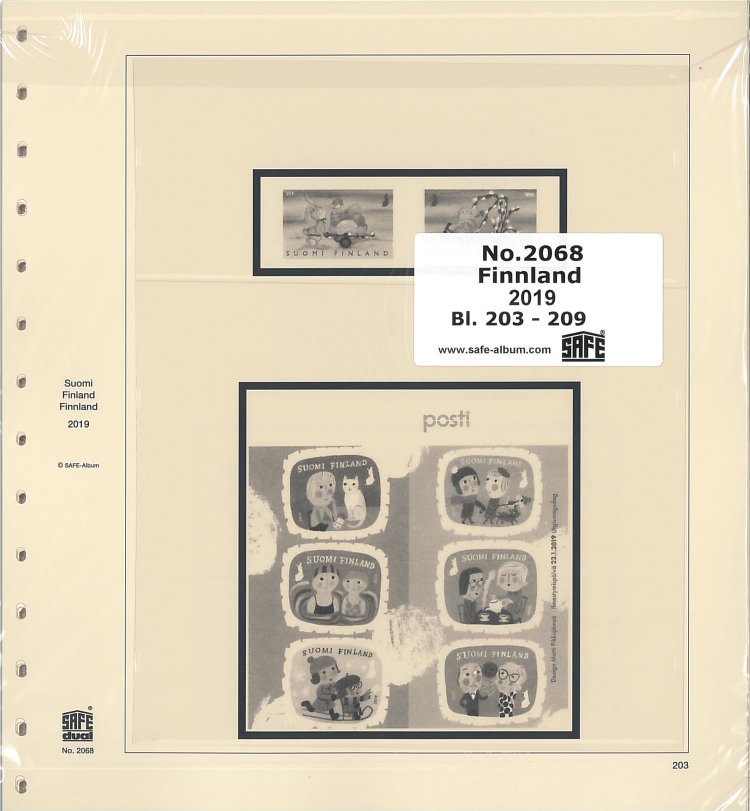 Kompletteringsblad för 2019 års frimärken till SAFE Dual album Finland. Med fickor och förtryck.