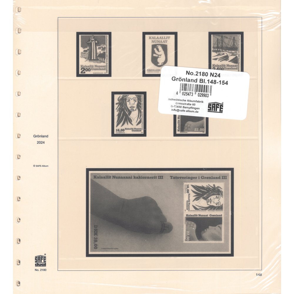 Kompletteringsblad för 2024 års frimärken till SAFE Dual album Grönland. Med fickor och förtryck.