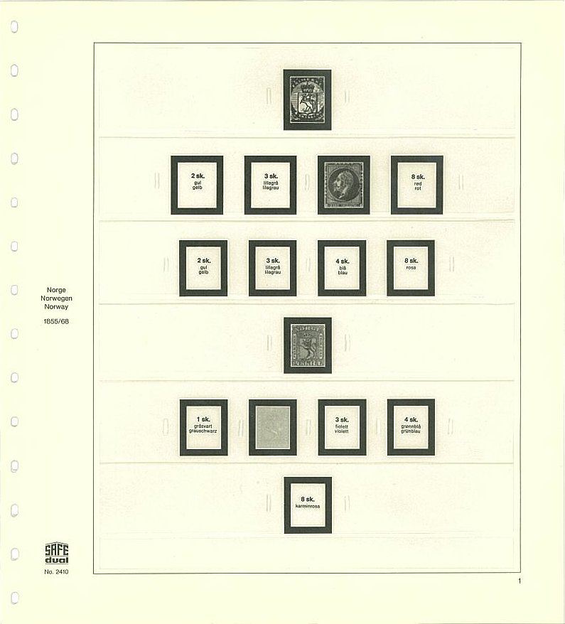 Bladsats med förtryck och fickor för samtliga norska frimärken utgivna år 1855-1945.