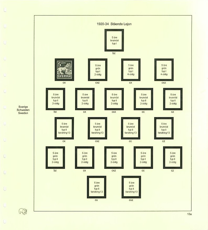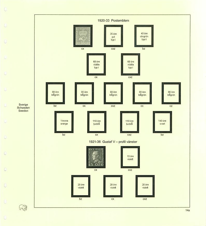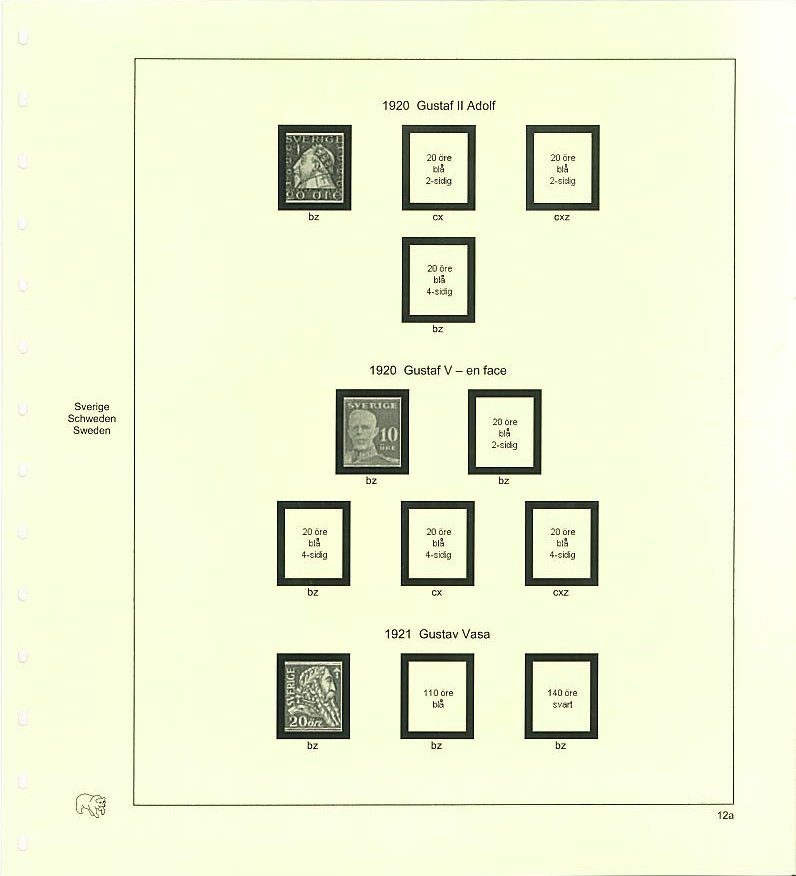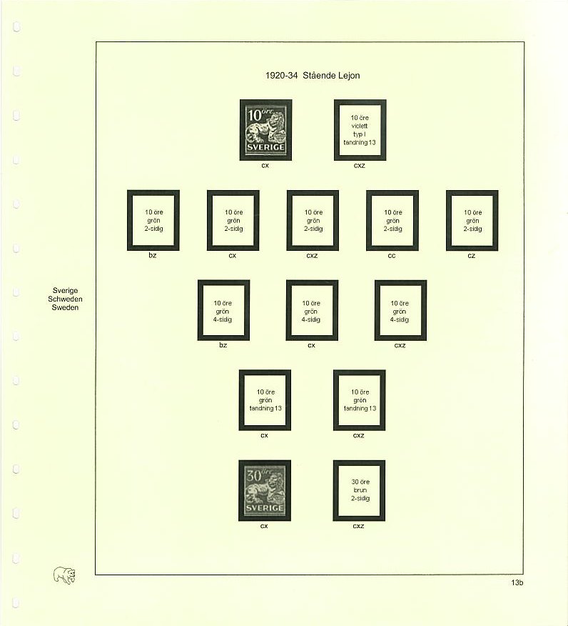 Bladsats med förtryck och dubbla klämfickorfickor för alla vattenmärksvarianter mellan åren 1921-1934.