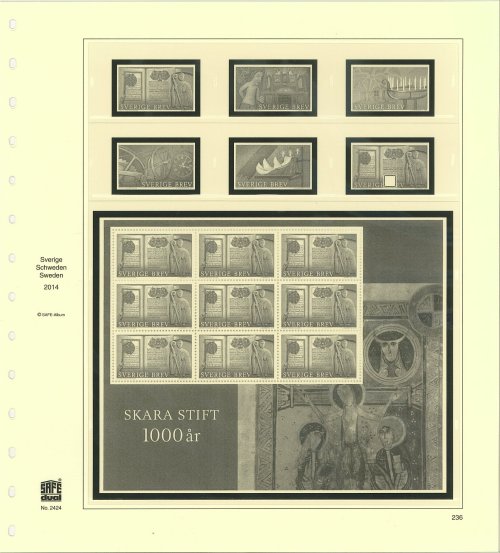 Kompletteringsblad för 2013 års frimärken till SAFE Dual album Sverige. Med fickor och förtryck. Inkl. blad till miniarken