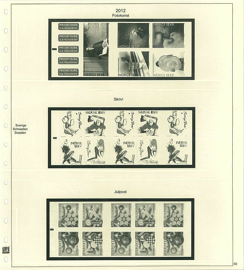 Kompletteringsblad för 2012 års frimärken till SAFE Dual album Sverige. Med fickor och förtryck. Inkl. blad till miniarken