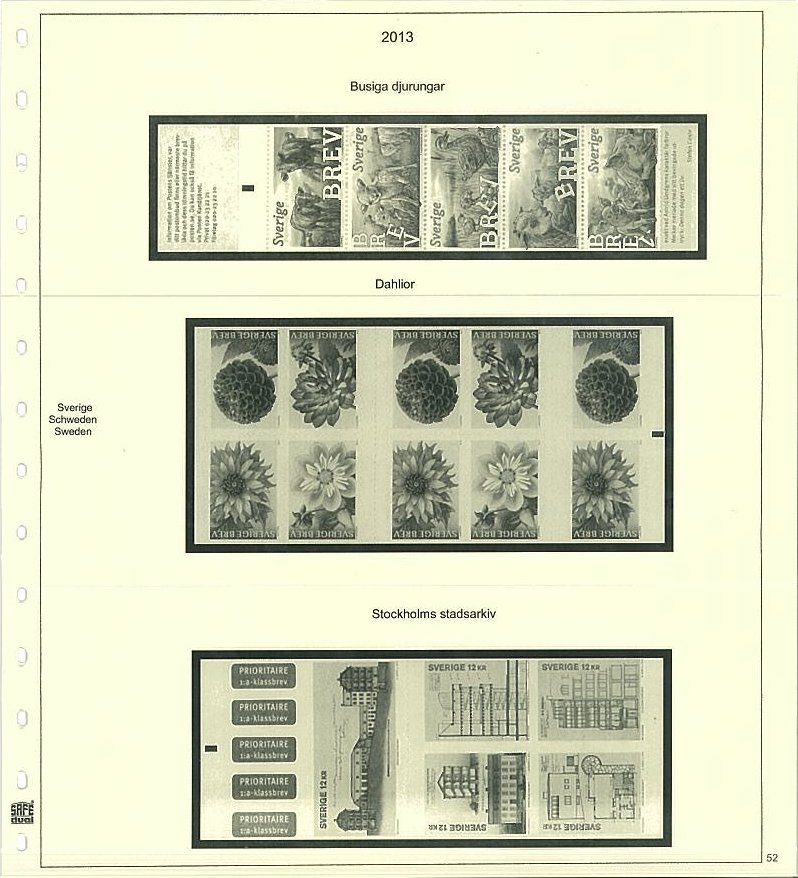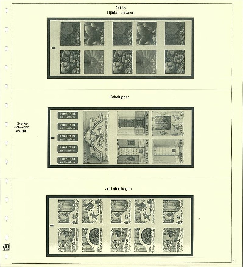 Kompletteringsblad för 2013 års frimärken till SAFE Dual album Sverige. Med fickor och förtryck. Inkl. blad till miniarken