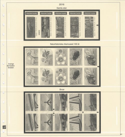 Kompletteringsblad för 2016 års frimärken till SAFE Dual album Sverige. Med fickor och förtryck. Inkl. blad till miniarken