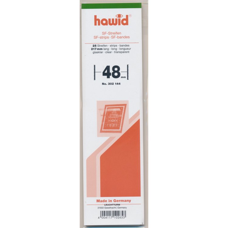 Fickorna är gummerade på baksidan. Format: Längd 217 mm För frimärken med höjd 28 mm Färg: glasklar bakgrund Förpackning med 25 fickor Fickorna finns i fler olika storlekar, se här