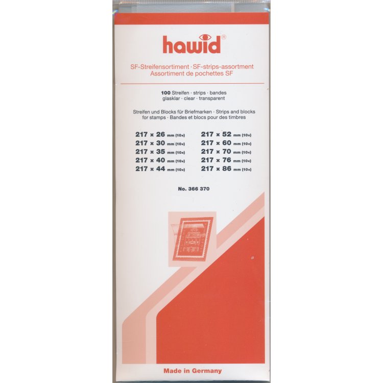 Fickorna är gummerade på baksidan. Format: Längd 217 mm För frimärken med höjd 28 mm Färg: glasklar bakgrund Förpackning med 25 fickor Fickorna finns i fler olika storlekar, se här