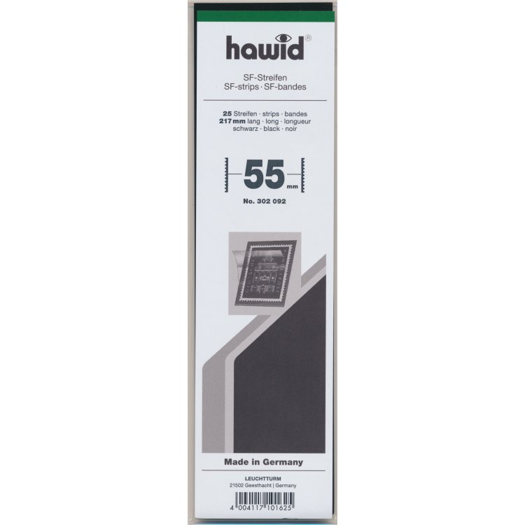 Fickorna är gummerade på baksidan. Format: Längd 217 mm För frimärken med höjd 24 mm Färg: svart bakgrund Förpackning med 25 fickor Fickorna finns i flera olika storlekar, se här
