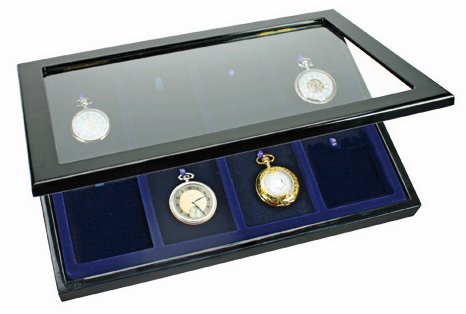 8 fack (78×103 mm)klädda med blå velour, varje fack har en löstagbar kudde med upphängningskrok för att fästa ur eller smycken