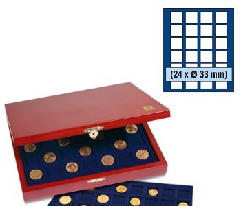 Levereras med tre brickor med vardera 24 kvadratiska fack med diametern 33 mm. Totalt plats för 72 mynt. Passar t.ex. svenska 2 kronor. (NOVA 6333)