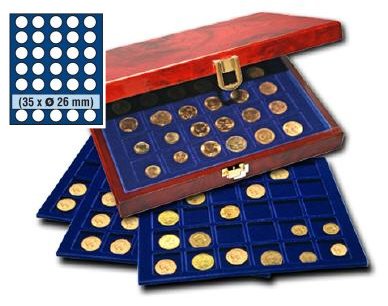 Levereras med tre brickor med vardera 35 runda fack med diametern 26 mm. Totalt plats för 105 mynt. Passar t.ex. svenska 1 kronor.(NOVA 6326)