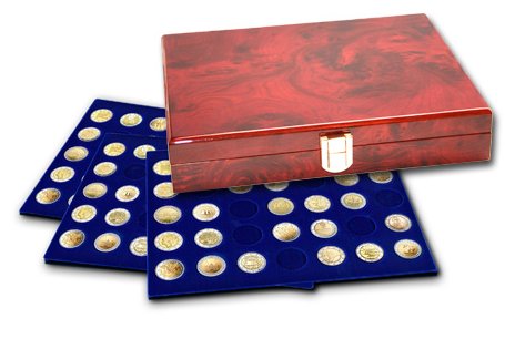 Levereras med tre brickor med vardera 30 runda fack med diametern 32,5 mm. Totalt plats för 90 mynt. Passar t.ex. svenska 2 kronor. (NOVA 6332)