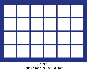 Stapelbar myntbox med 30 fack för mynt med Ø 30 mm. Passar t.ex. svenska 5 kronor 1972- Passar även till ölkapsyler och champagnekorkar Boxens yttermått: 250 x 195 x 17 mm