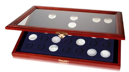 Högklassiskt trä utförande Träramen med glasinfattningen är helt uppfällbar Mässingsfärgade beslag för upphängning Knapplås av mässing Storlek: 375x260x30 mm 24 runda fack á 38,5mm Passar t.ex. svenska jubileumsmynt