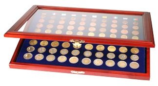 Högklassiskt trä utförande Träramen med glasinfattningen är helt uppfällbar Mässingsfärgade beslag för upphängning Knapplås av mässing Storlek: 375x260x30 mm 40 runda fack á 26mm Passar t.ex. 1 kronor