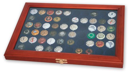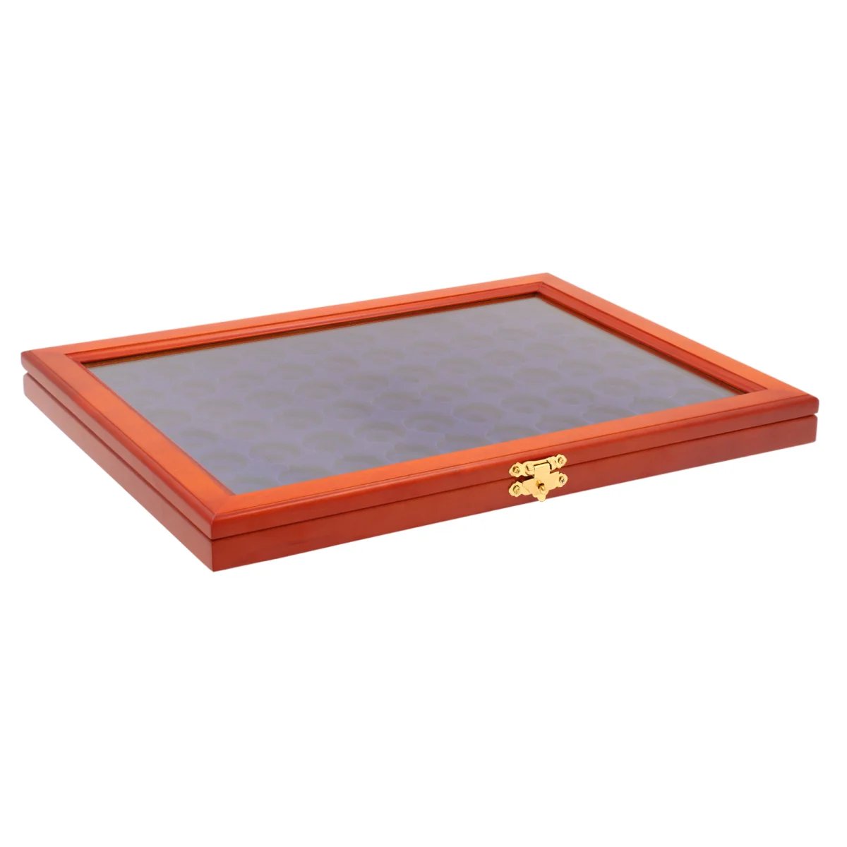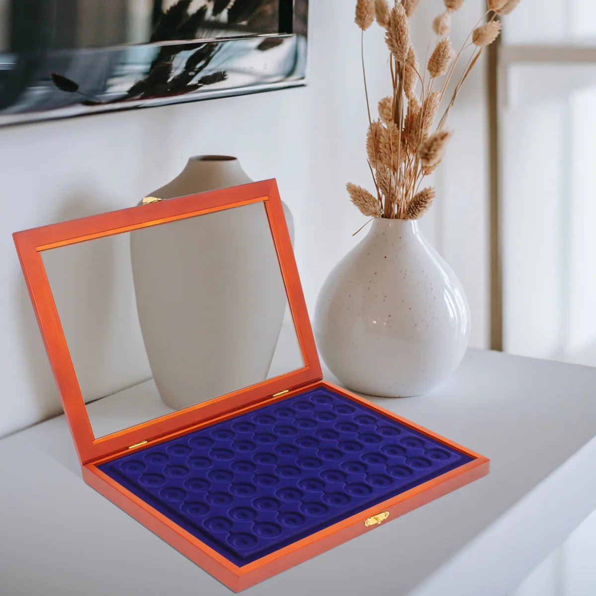 Högklassiskt trä utförande Träramen med glasinfattningen är helt uppfällbar Mässingsfärgade beslag för upphängning Knapplås av mässing Storlek: 375x260x30 mm Med 35 runda fack 32,5mm Passar t.ex. svenska 2 kronor