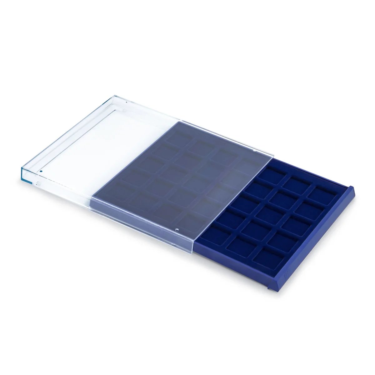 Innerhöjd 12 mm. Låda till Premiumskåpet med fackindelningen enligt bilden, klädd i blå sammet. 48 kvadratiska fack á 33mm Passar t.ex. 2 kronor