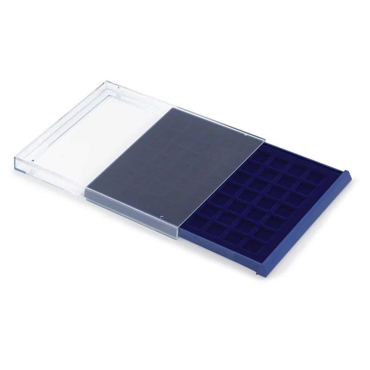 Stapelbar myntbox med 30 runda fack för mynt med Ø 32,5 mm. Passar t.ex. svenska 1 kronor i kapslar 2 kronor alla årtal 10 kronor jubileum 1972 100 kronor jubileumsmynt Boxens yttermått: 250 x 195 x 17 mm