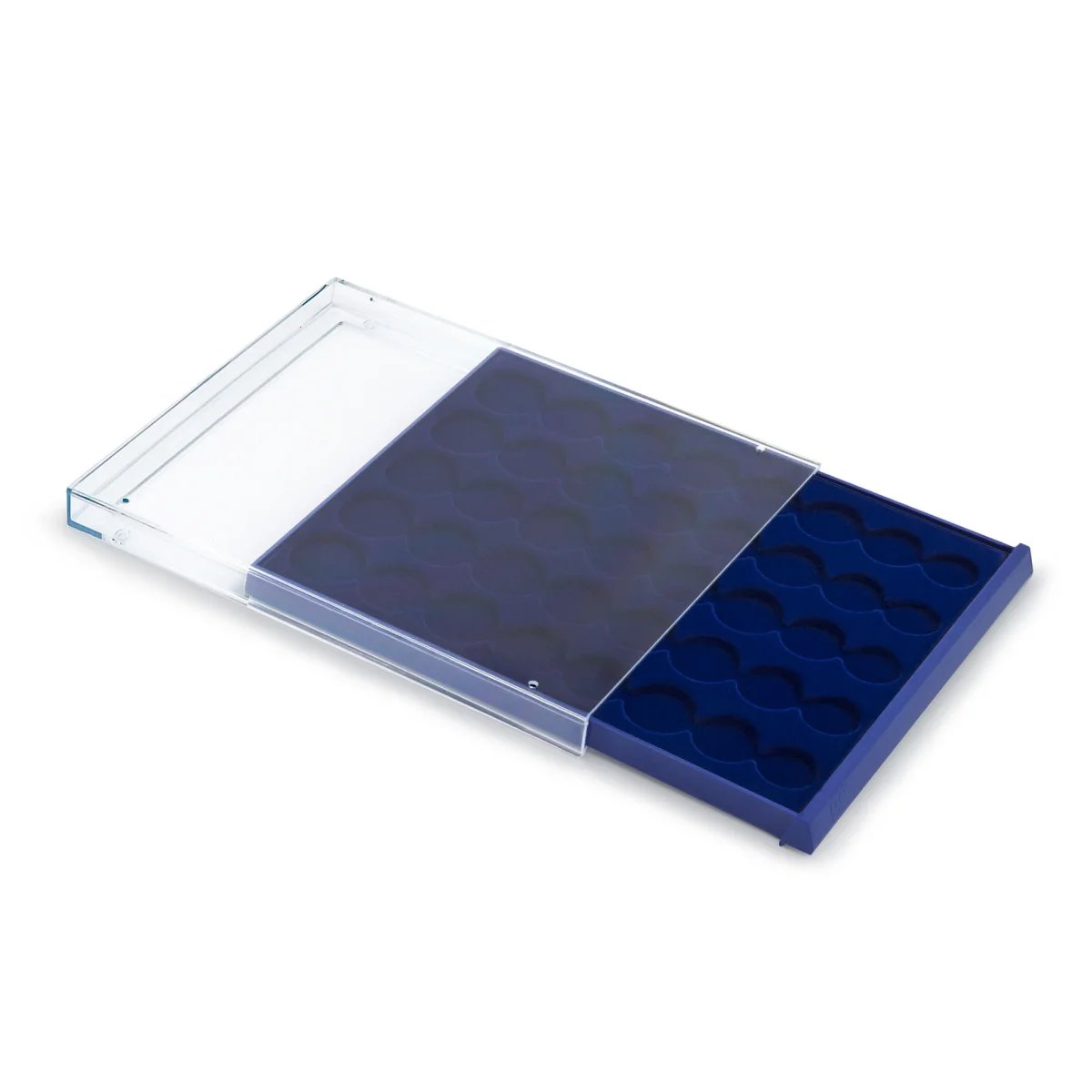 Innerhöjd 12 mm. Låda till Premiumskåpet med fackindelningen enligt bilden, klädd i blå sammet. Runda fack för 6 €urostastser i myntkapslar, 1 cent – 2 €uro