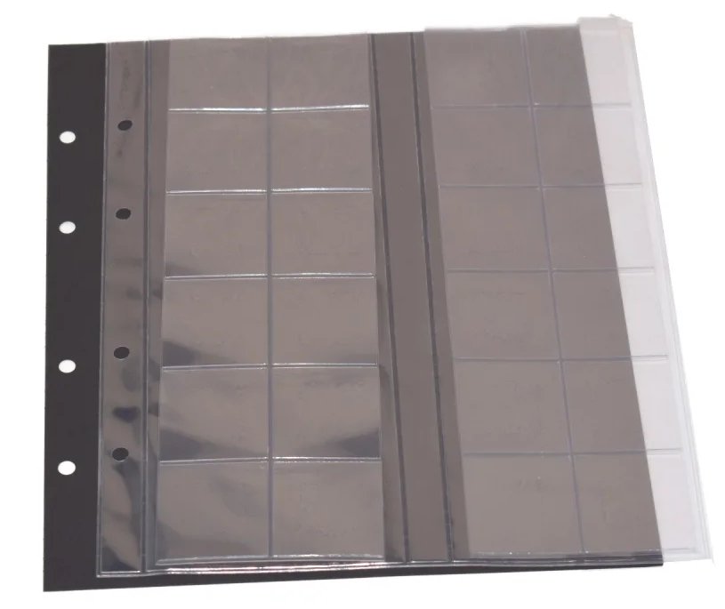 5 fickor/sida. Fickornas höjd 57 mm. Helt av folie, dubbelsidiga (fickor på båda sidor), svart bakgrund. Format: 240 x 305 mm Fickornas längd är 220 mm. Hålstansning för 4 ringar med avstånd 80-80-80 mm Paket med 5 blad