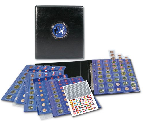 Komplett my ntalbum med 4 olika blad (nr 7391-7394) för stora och små mynt. Svart pärm med myntmotiv i formatet 240x275x45 mm. Pärmen rymmer fler blad, köp till art.nr 7391-7395.