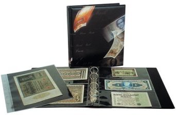 Komplett s edelalbum ART-Line. Svart pärm med sedelmotiv i formatet 240x275x45 mm. Levereras med 8 glasklara blad (2×1276, 4×1277 och 2×1278), svarta kartonginlägg medföljer bladen för dubbelsidig montering. Pärmen rymmer fler blad, art.nr 1276-1278.