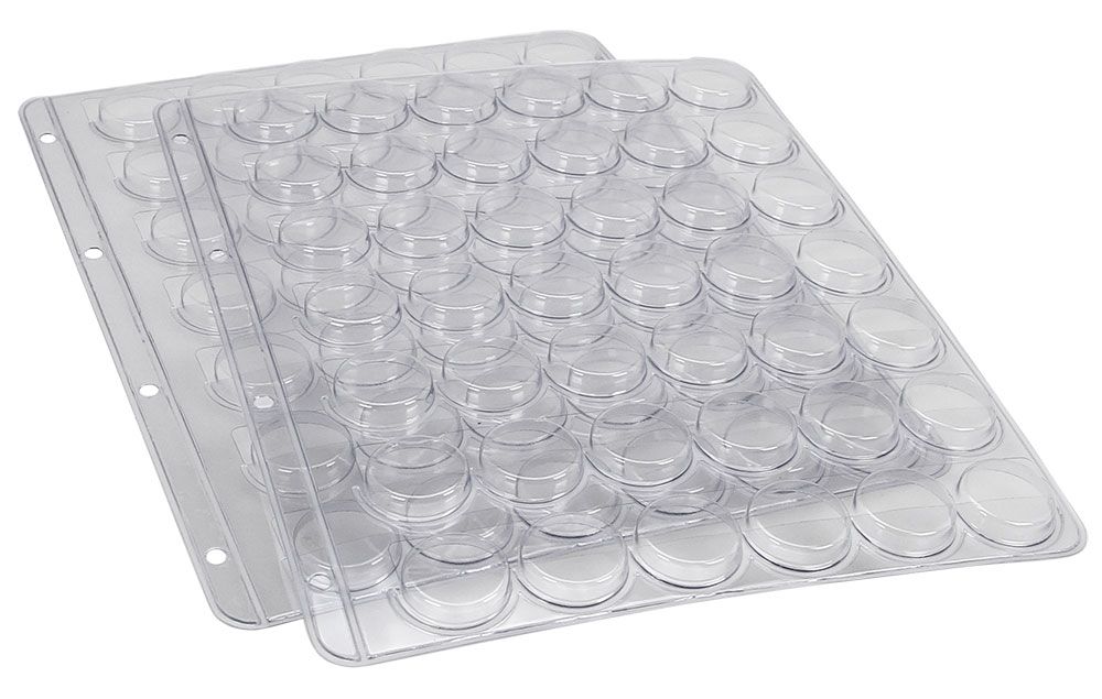 Transparanta blad för mynt. Levereras i 2-pack med svarta bakgrundsblad av kartong. Hålstansning för 4 ringar med avstånd 80-80-80 mm Finns i 3 olika storlekar på facken: 5410 med 15 fack 44mm 5411 med 24 fack 32 mm 5412 med 35 fack 25 mm