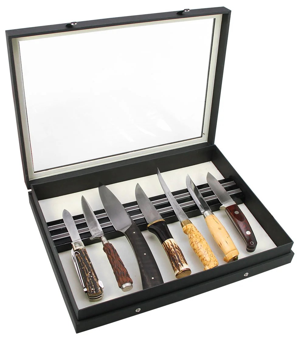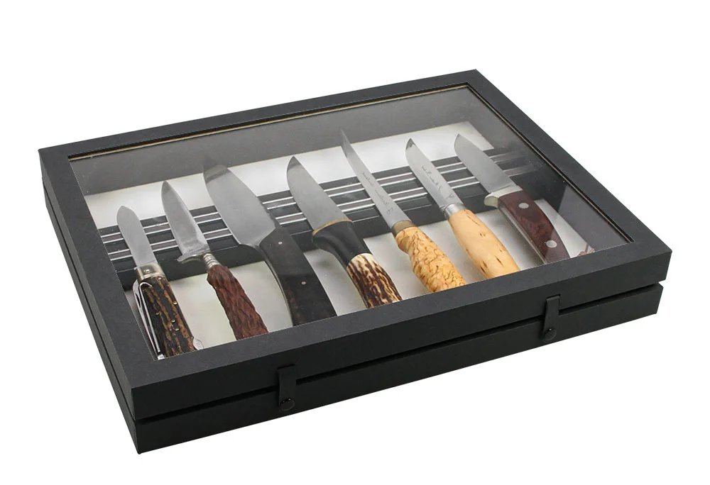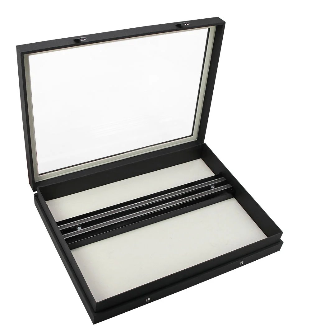 Den nya serien av samlarvitriner i stabil mattsvart linnestruktur med glaslock och två knapplås. Tidlöst eleganta med flera olika förvaringsmöjligheter. Yttermått 400 x 300 x 55 mm Innerhöjd 43 mm 45 fack med måtten 36 x 49 mm