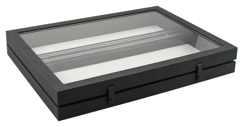Den nya serien av samlarvitriner i stabil mattsvart linnestruktur med glaslock och två knapplås. Tidlöst eleganta med flera olika förvaringsmöjligheter. Yttermått 400 x 300 x 55 mm Innerhöjd 43 mm 12 fack med måtten 87 x 90 mm