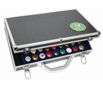 Elegant design med metallplakett på ovansidan. Förstärkta kanter och hörn. 2 lås och praktiskt bärhandtag. 5 brickor klädda i blå sammet för totalt 270 champagnekapsyler. Yttermått 410 x 270 x 85 mm