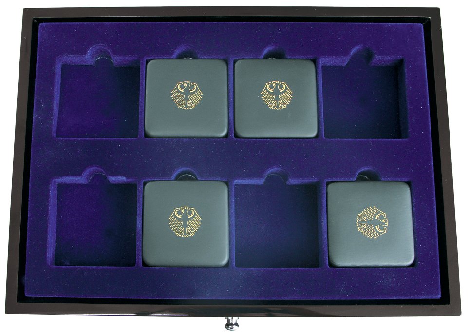 Låda till Premiumskåpet med fackindelningen enligt bilden, klädd i blå sammet. 8 fack för etuier 68×68 mm Låda med innerhöjd 25mm (tar 2 platser i skåpet)