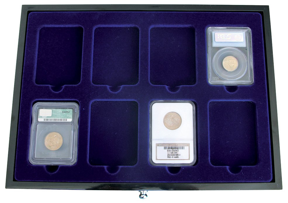 Låda till Premiumskåpet med fackindelningen enligt bilden, klädd i blå sammet. 8 fack för etuier till 100 Euro guldmynt Låda med innerhöjd 25mm (tar 2 platser i skåpet)