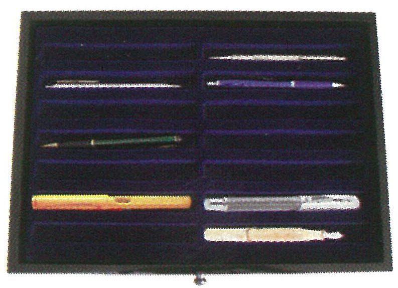 Vitrinbox för 8 pennor i vadderat svart konstläder Uppfällbart lock med glasinfattning Insidan klädd i ljusgrå velour Låsbar med nyckel Yttermått ca. 266 x 180 x 64 mm