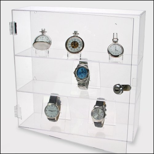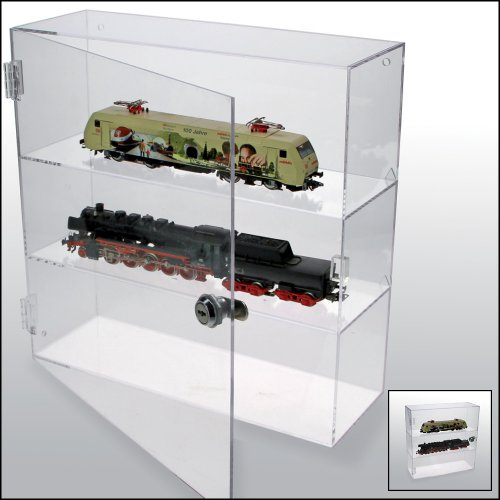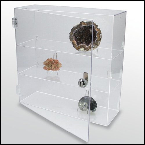 Vitrin helt i akrylglas utan störande ramar eller beslag. Försedd med låsbar dörr. Går att ställa på bord, i hylla eller hänga på väggen. Hål för upphängning finns på baksidan.
