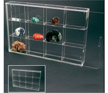 Vitrin helt i akrylglas utan störande ramar eller beslag. Försedd med skjutdörr. Går att ställa på bord, i hylla eller hänga på väggen. Hål för upphängning finns på baksidan. Yttermått: 180x115x45 mm 12 fack Innermått facken: 40x35x42 mm