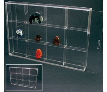 Vitrin helt i akrylglas utan störande ramar eller beslag. Försedd med skjutdörr. Går att ställa på bord, i hylla eller hänga på väggen. Hål för upphängning finns på baksidan. Yttermått: 180x115x45 mm 12 fack Innermått facken: 40x35x42 mm