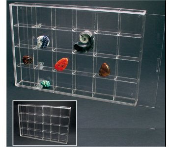 Vitrin helt i akrylglas utan störande ramar eller beslag. Försedd med skjutdörr. Går att ställa på bord, i hylla eller hänga på väggen. Hål för upphängning finns på baksidan. Yttermått: 300x200x45 mm 20 fack Innermått facken: 57x47x42 mm
