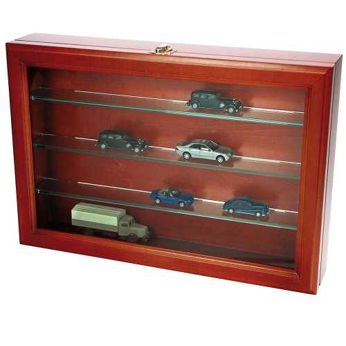 Högvärdig trävitrin för dina exklusiva objekt. Idealisk för mineraler, figurer, bilar, modelltåg eller andra mindre samlarobjekt. Hantverksmässigt gjord i ädelt trä med mahognyfinish. Fronten är öppningsbar med glasinfattning. Guldfärgade beslag och lås med nycklar. Vitrinen kan hängas på väggen eller placeras på ett bord eller i en hylla. De medföljande flyttbara hyllplanen (3st) i glas [...]