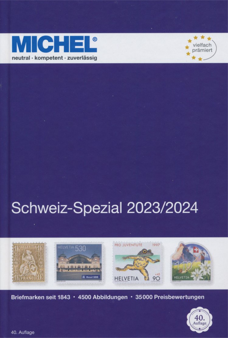 Inbunden specialkatlog över Schweiz frimärken i färg.
