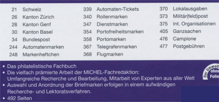 1:a upplagan av Michels nya färgkarta, ”Farbfächer Kompakt”.Som en solfjäder med 6 färger/nyanser pĂĄ varje blad. Bestämmande av färger bör göras i dagsljus, ej elektriskt ljus dĂĄ detta oftast förvränger frimärkets färg. Jämför alltid en yta av märket som är helt infärgat och utan stämpel, eftersom frimärkets papper (t.ex. gul- eller blĂĄaktigt) eller stämpeln ofta [...]