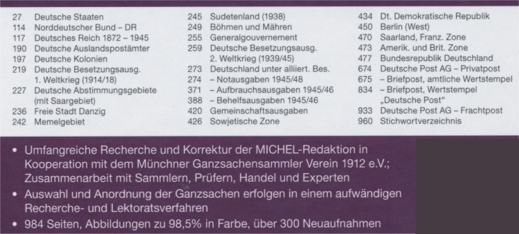 Inbunden specialkatalog. Katalogen är tyskspråkig med priser i Euro och helt i färg. Band 1 omfattar åren 1849-1945 (till 2:a världskrigets slut) med samtliga områden och stater. Mycket omfattande katalog som listar samtliga kända nyanser, vattenmärken och en mängd varianter. Även brevpriser. Den mest omfattande Tysklandskatalogen på marknaden.